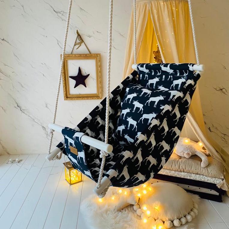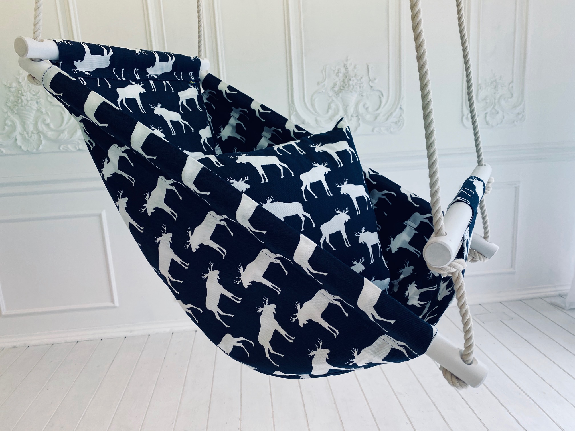 Älg babygunga – en riktig svensk klassiker. När svensk design och hantverk är som finast. Tyget är mjukt och härligt med snyggt älgmotiv på en denim-blå bakgrund. En matchande älgkudde medföljer. Kudden kan du placera vid babygungans rygg. En babygunga från Videung of Sweden har en härligt naturlig gung som din baby kommer att älska. Träpinnarna i björk är handmålade och passar perfekt med det denim-blå tyget.